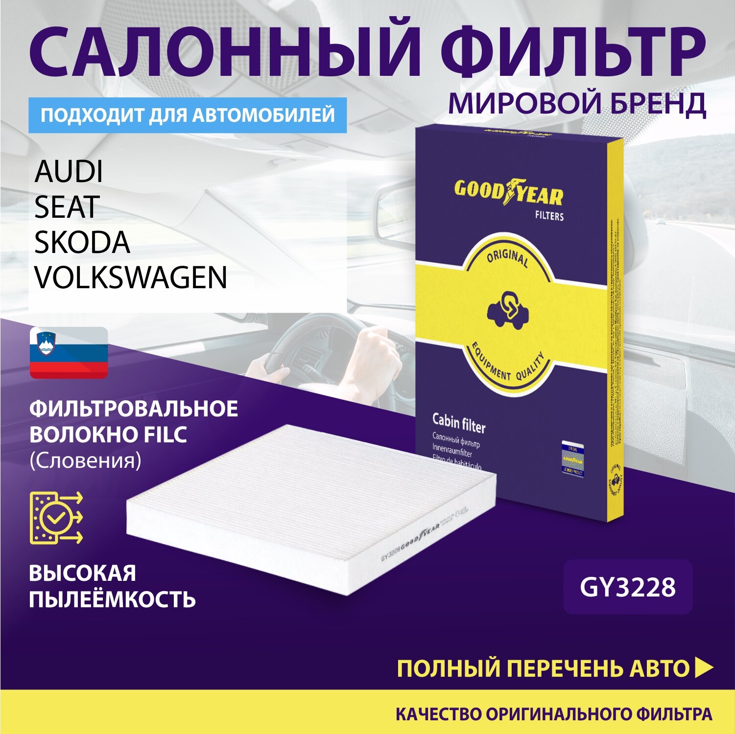 Фильтр салонный KODIAQ, OCTAVIA III, SUPERB III, GOLF VII, PASSAT (3G2/3G5), TERAMONT, TIGUAN ALLSPA, GOODYEAR GY3228