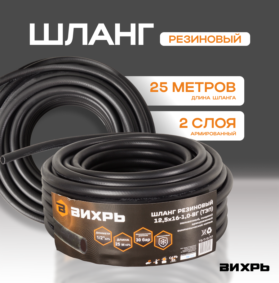Шланг резиновый армированный, 12,5 х 16- 1,0 - ВГ., бухта 25м (чёрный) ТЭП Вихрь интересное: