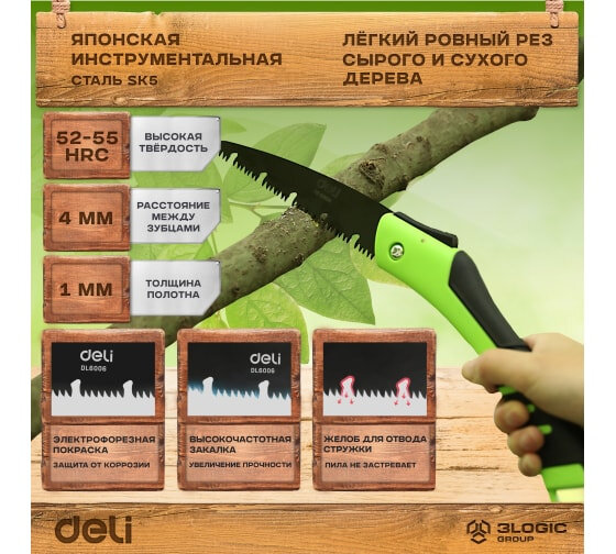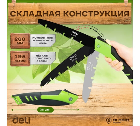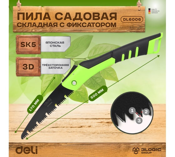 Садовая пила складная Deli DL6006 180мм, сталь 65MN, шаг зубьев 7 TPI
