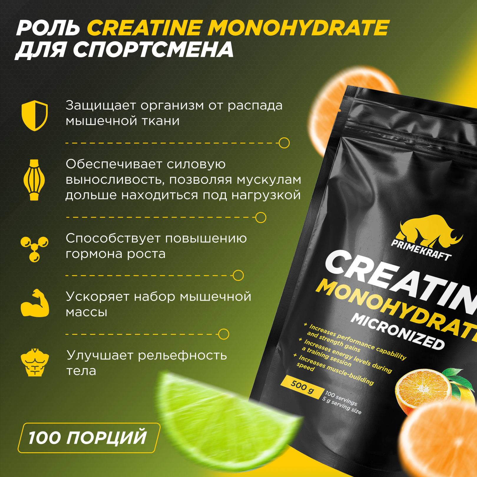 СохранитьКреатин Моногидрат PRIMEKRAFT Creatine Monohydrate Micronized, citrus mix (цитрусовый микс), 500 гр / 100 порций интересное: