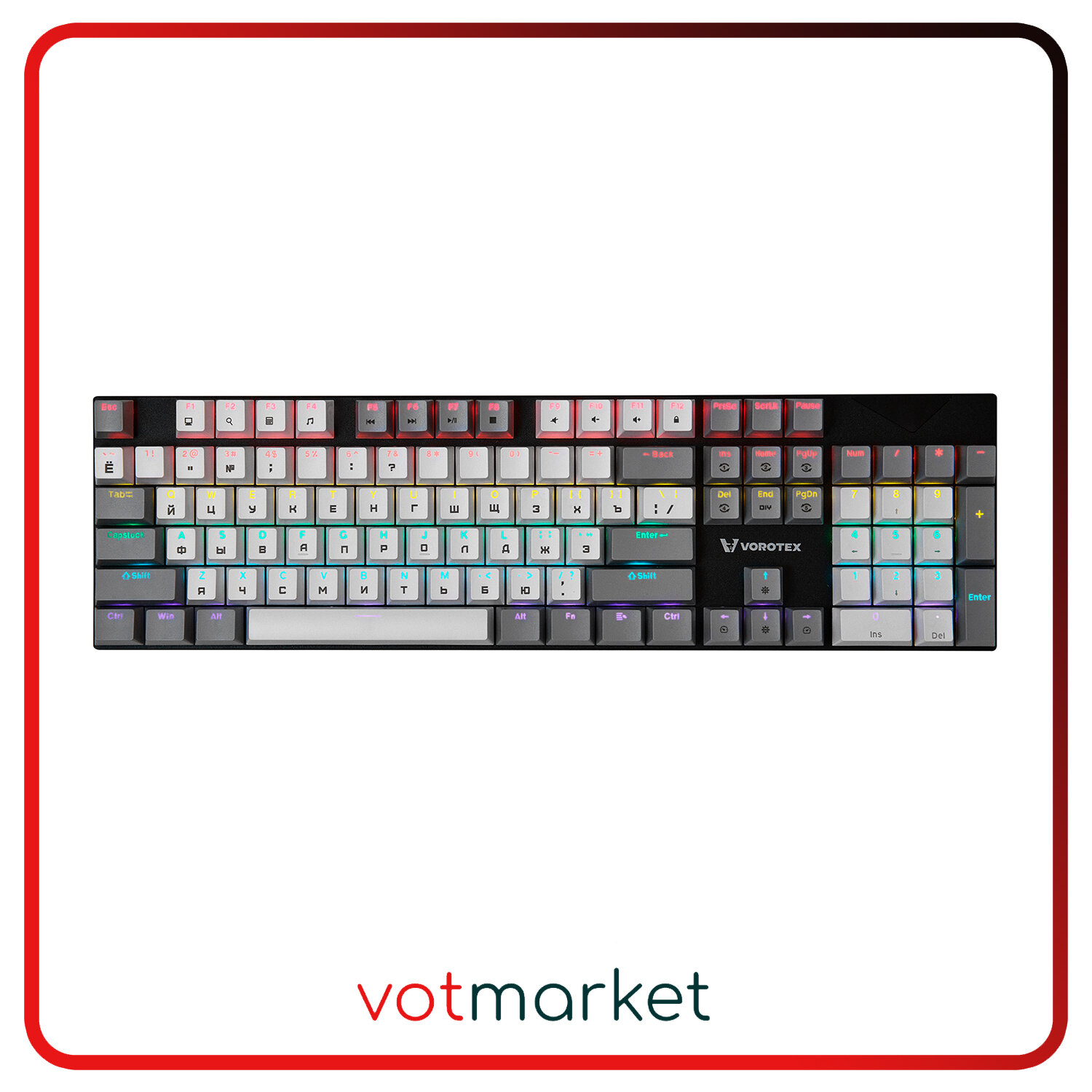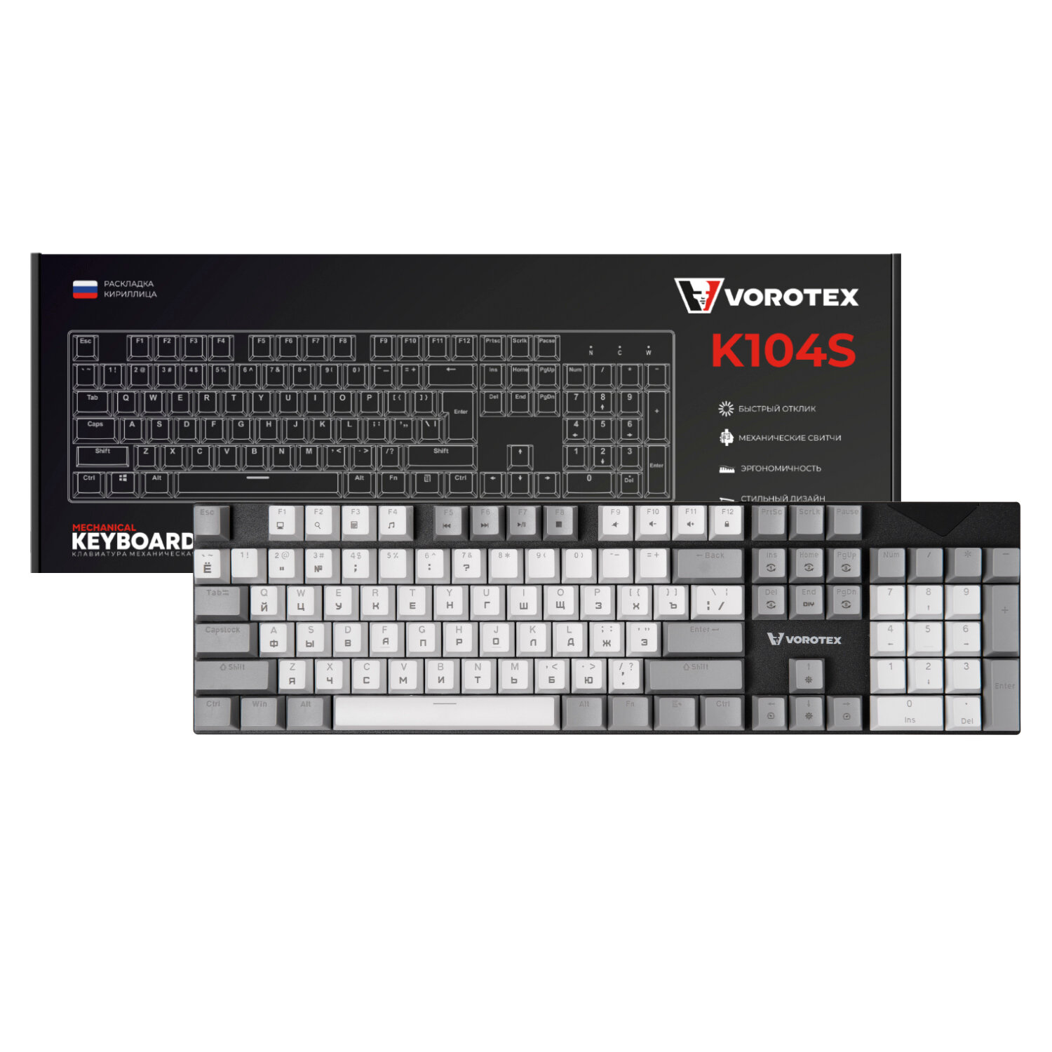 Клавиатура игровая проводная VOROTEX K104S Red Switch, русская раскладка (Чёрный, белый)
