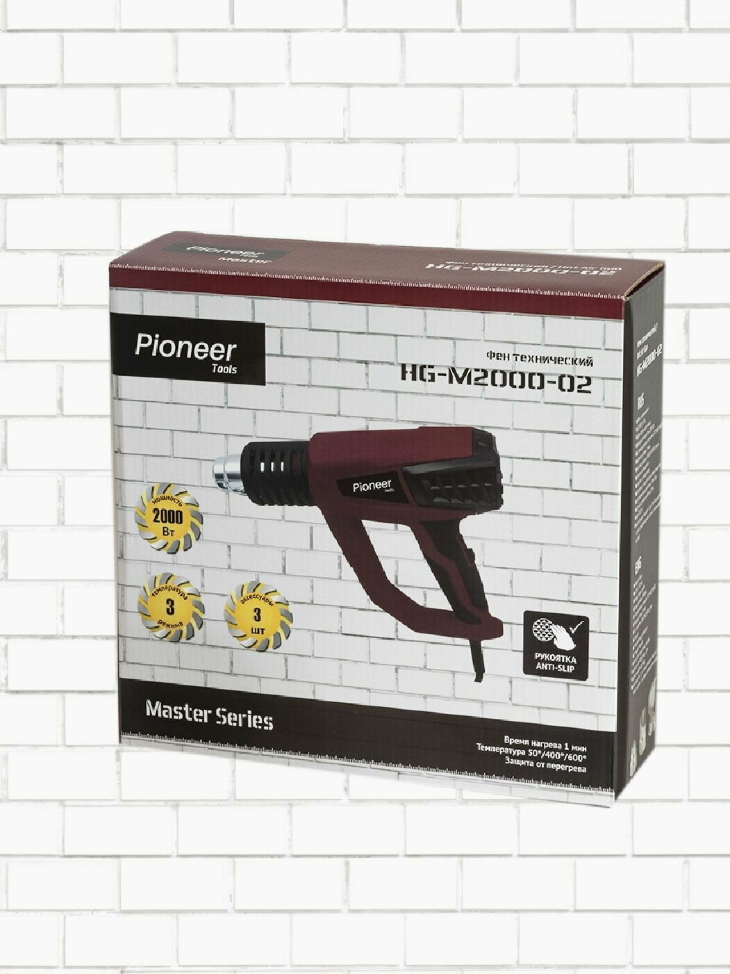 Фен строительный Pioneer HG-M2000-02 с щеточным двигателем, 3 температурных режима 50, 400 и 600 градусов, режим охлаждения, нагрев за минуту, 3 насадки, 2000 Вт