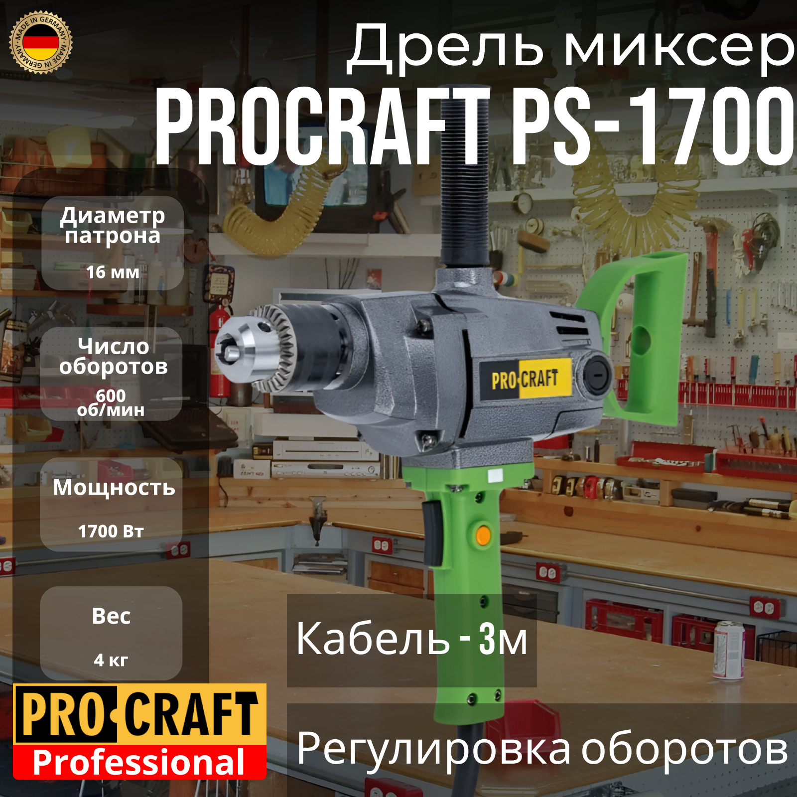 Купить Дрель-миксер Procraft PS-1700, патрон 16мм, 1700Вт, 600об/мин