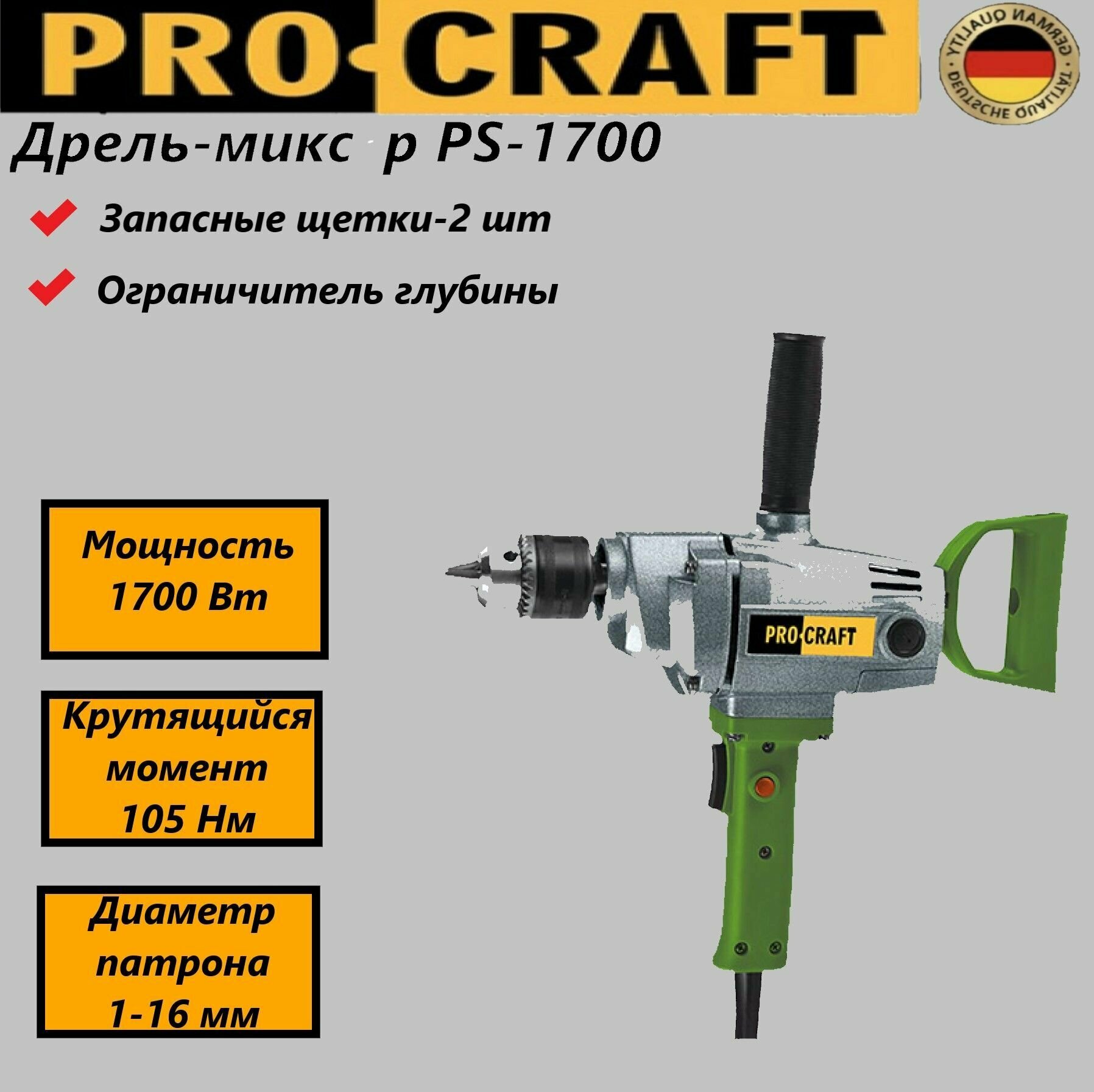 Дрель-миксер Procraft PS-1700, патрон 16мм, 1700Вт, 600об/мин интересное: