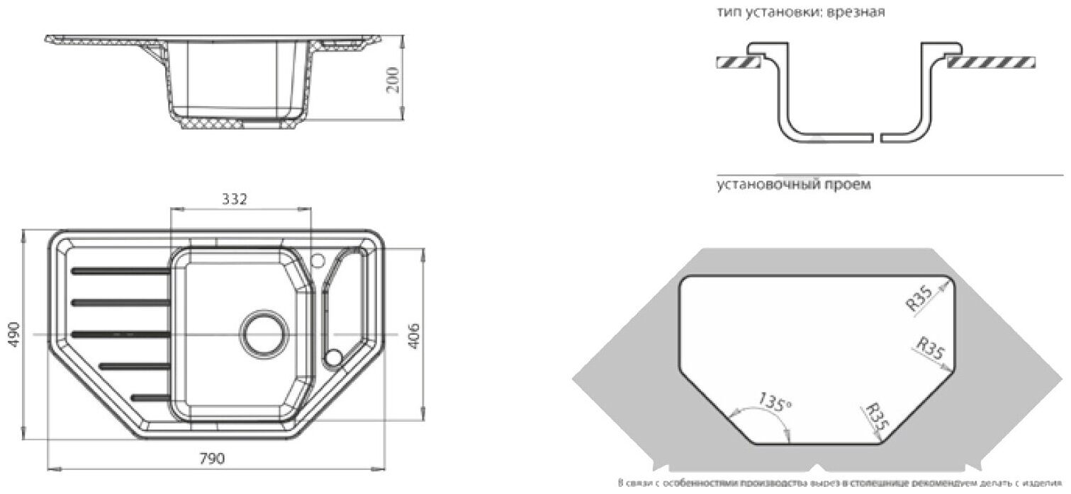 Мойка GRANFEST GF-C800E угловая 790*490 мм (топаз)