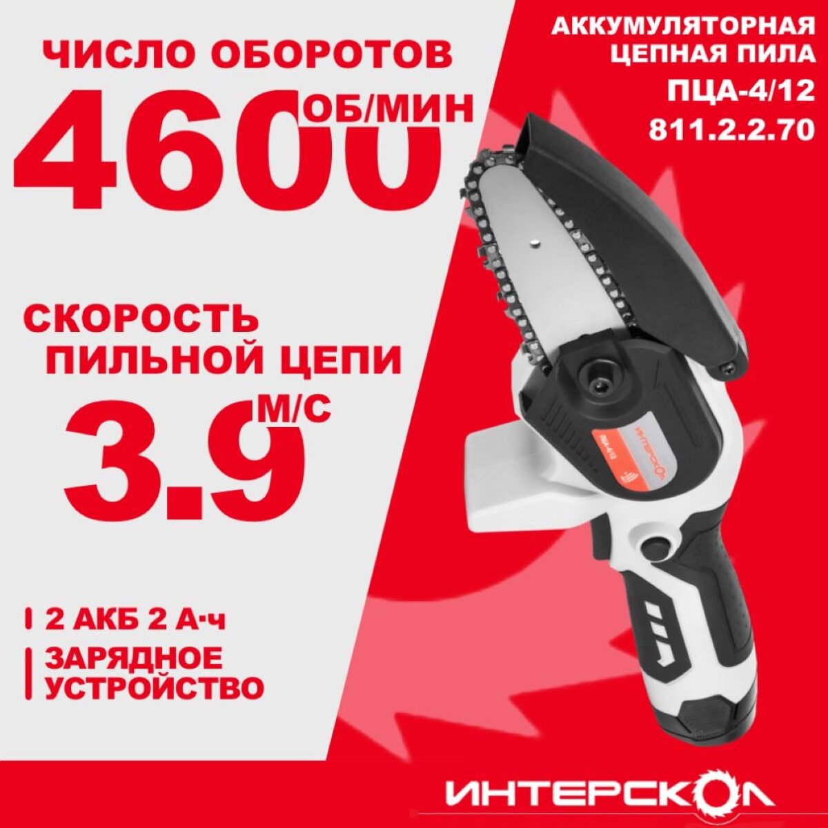 Купить Аккумуляторная цепная пила ИНТЕРСКОЛ ПЦА-4/12, 12 В, 4600 об/мин, с 2 АКБ 2 Ач и ЗУ, 811.2.2.70