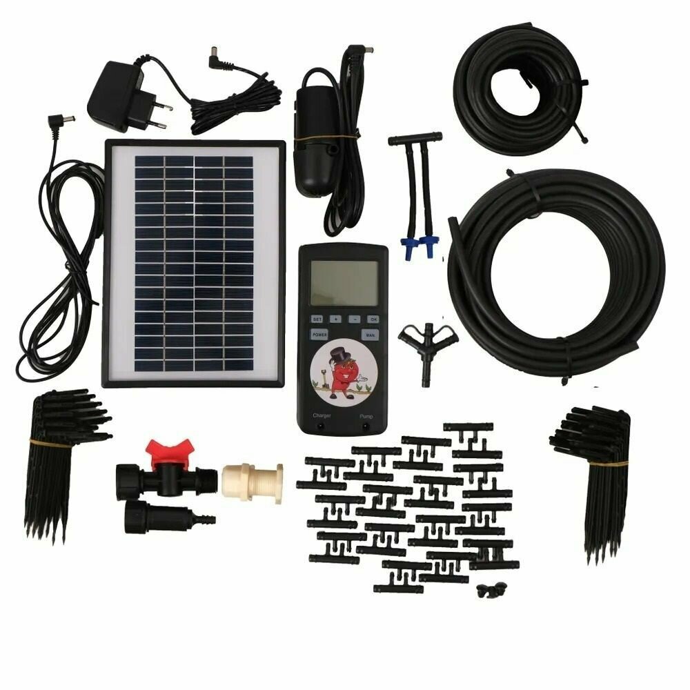 | Комплектация | шланг подачи воды диаметром 7/9 мм - 18 м, шланг капельного дозатора диаметром 4/6 мм - 17 м, большой разветвитель с пробкой - 1 шт, малый разветвитель - 30 шт, капельный дозатор - 60 шт, заглушка для подающего шланга - 3 шт, солнечная батарея - 1 шт, контроллер - 1 шт, антисифон - 1 шт, зарядное устройство - 1 шт, насос - 1 шт |