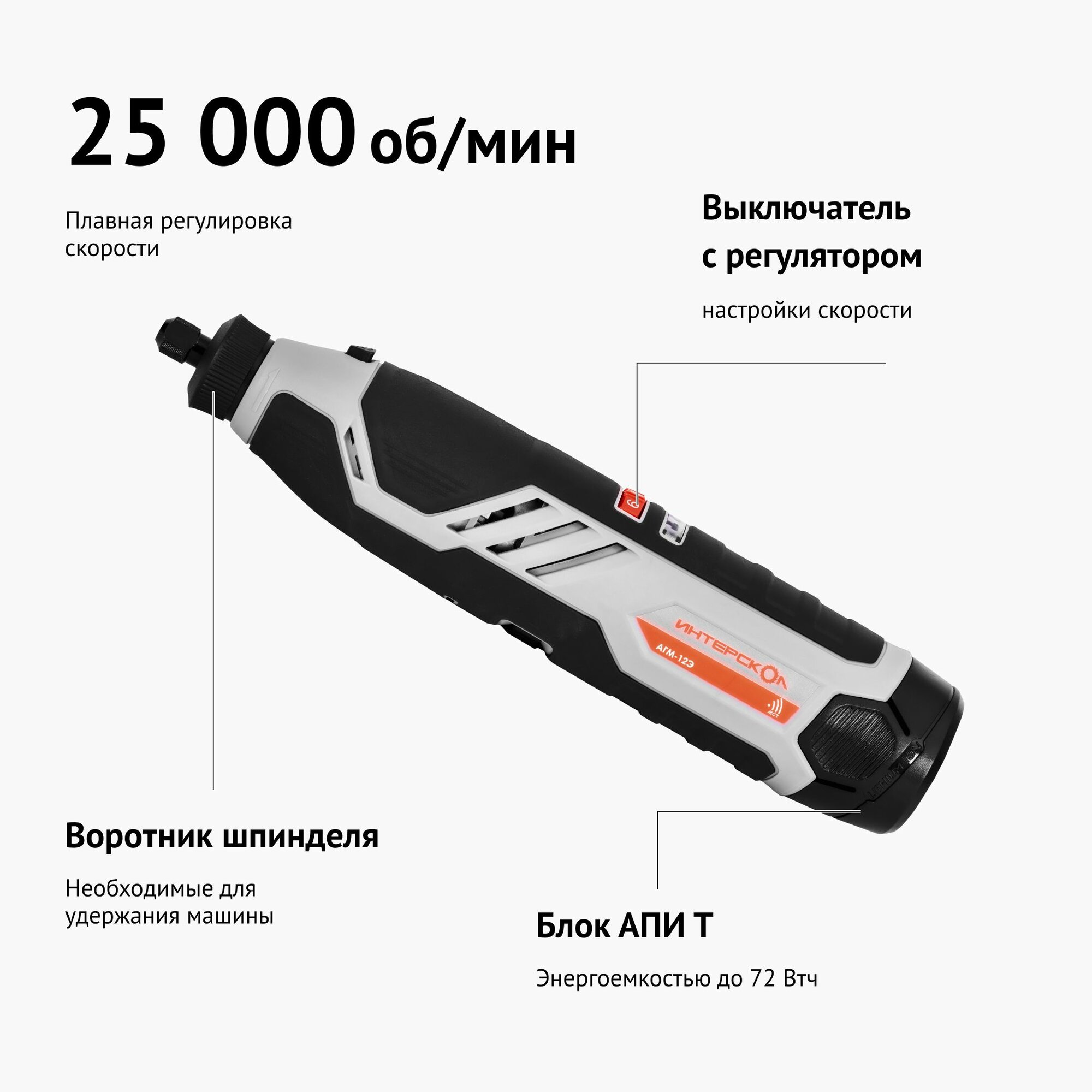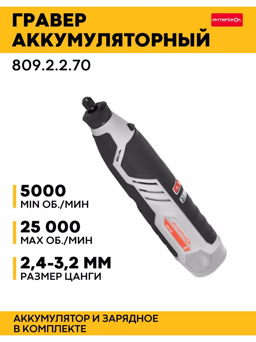 Аккумуляторный гравер ИНТЕРСКОЛ АГМ-12Э, 12 В, 25000 об/мин, с 2 АКБ 2 Ач и ЗУ, в кейсе, 809.2.2.70