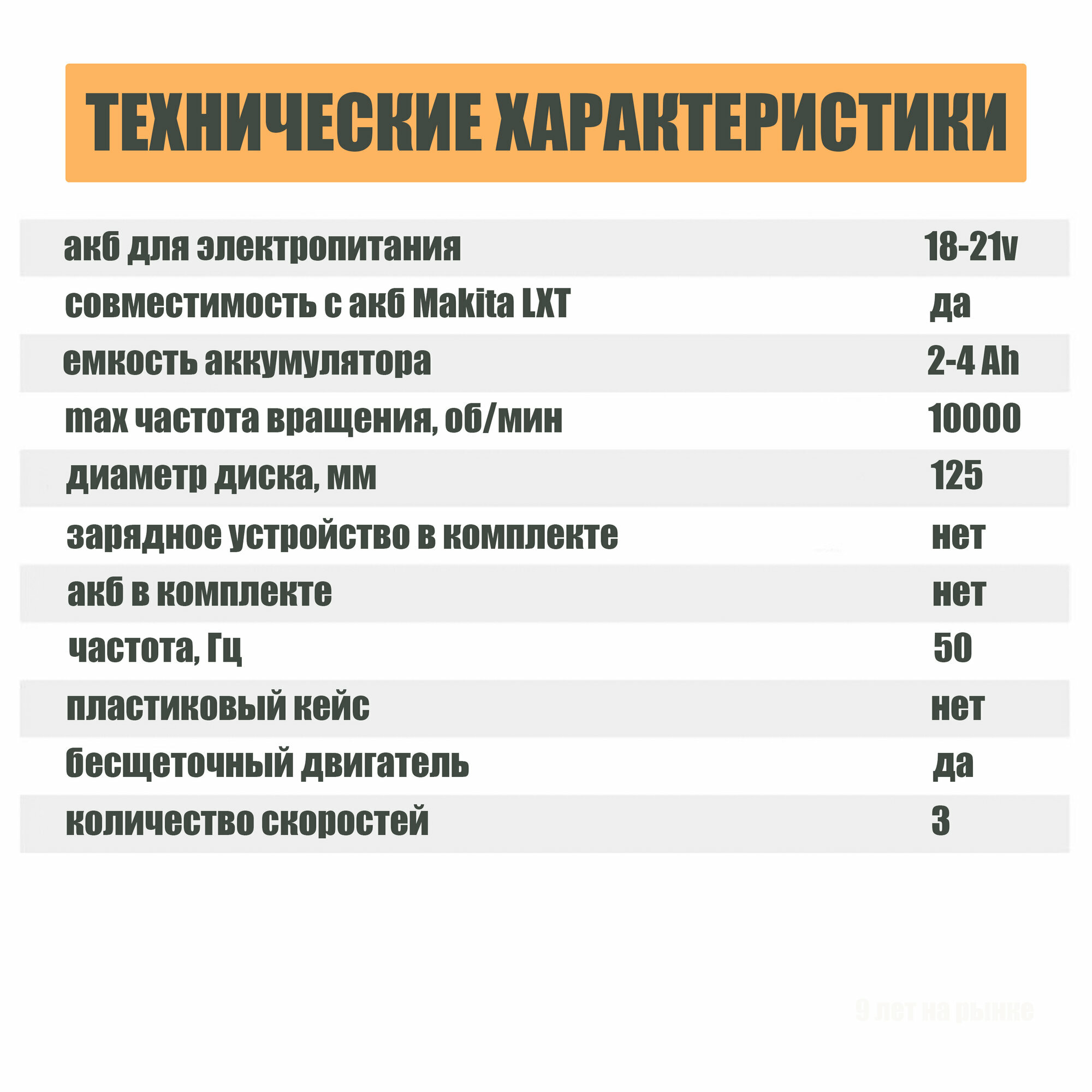 Аккумуляторная бесщеточная УШМ инток 10000/125 мм без АКБ, адаптирована к АКБ 18v Makita, 3 скорости оборотов