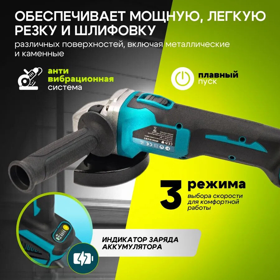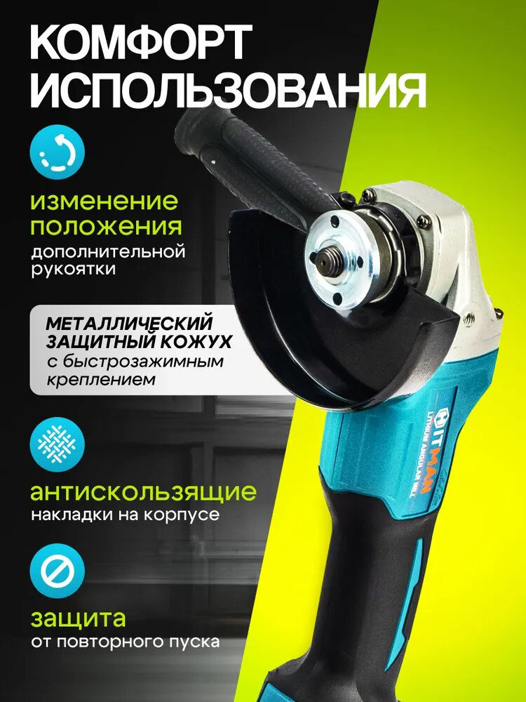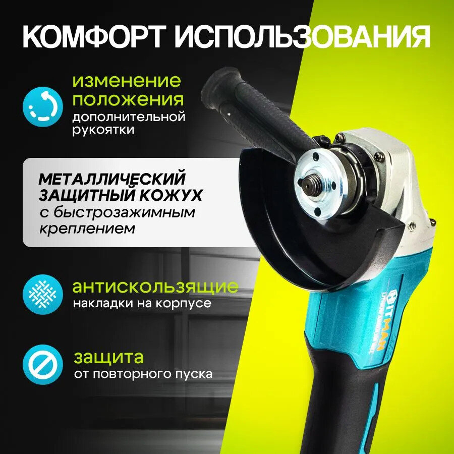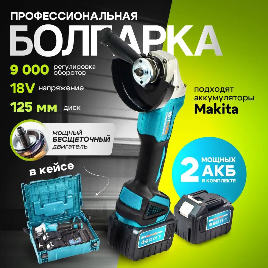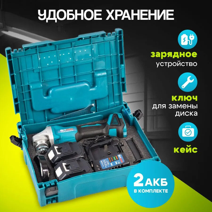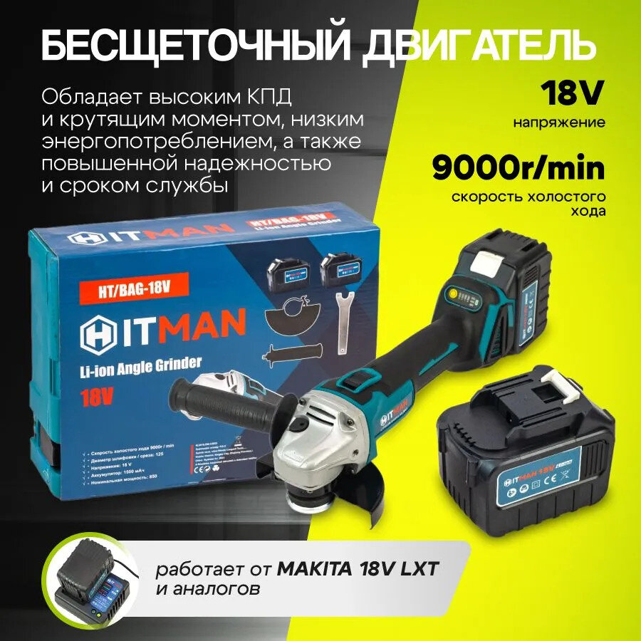 Угловая шлифовальная машина аккумуляторная Hitman BAG 18V, 18В, 9000 об/мин Болгарка/УШМ 125мм, кейс + 2 АКБ 4А*ч Без щеточная интересное: