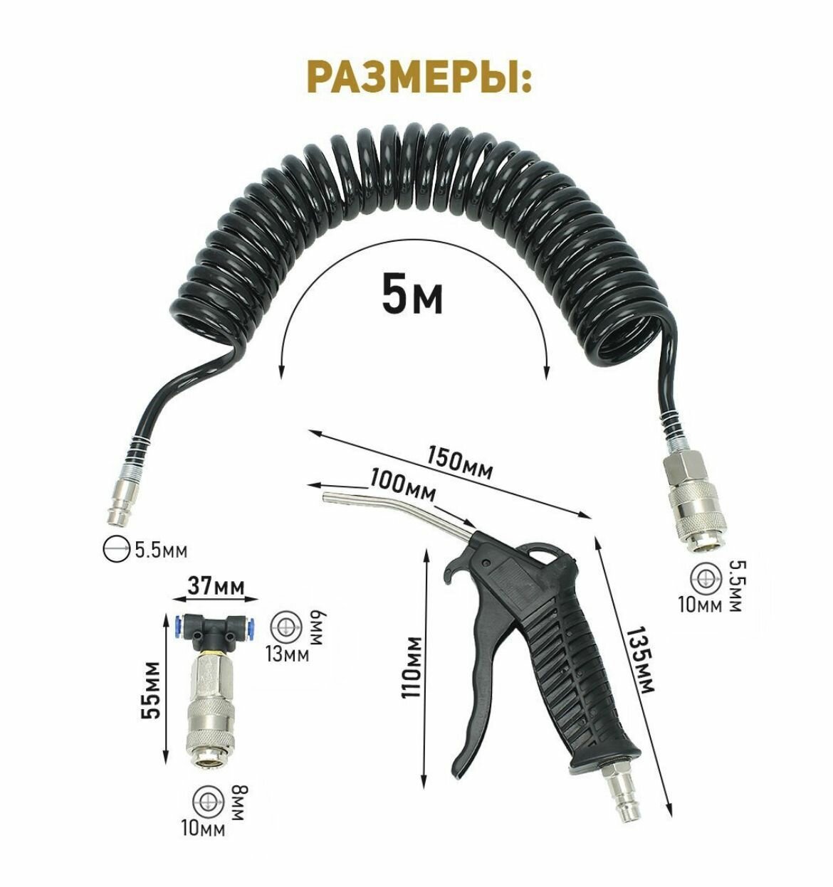 | Комплектация | - шланг с быстросъемными соединителями 1шт. - пистолет для продува 1шт - фитин-переходник с быстросъемом 1шт. |