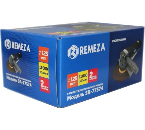 | Комплектация | Пневмоуглошлифмашина 125 мм. SR-77374 Remeza |