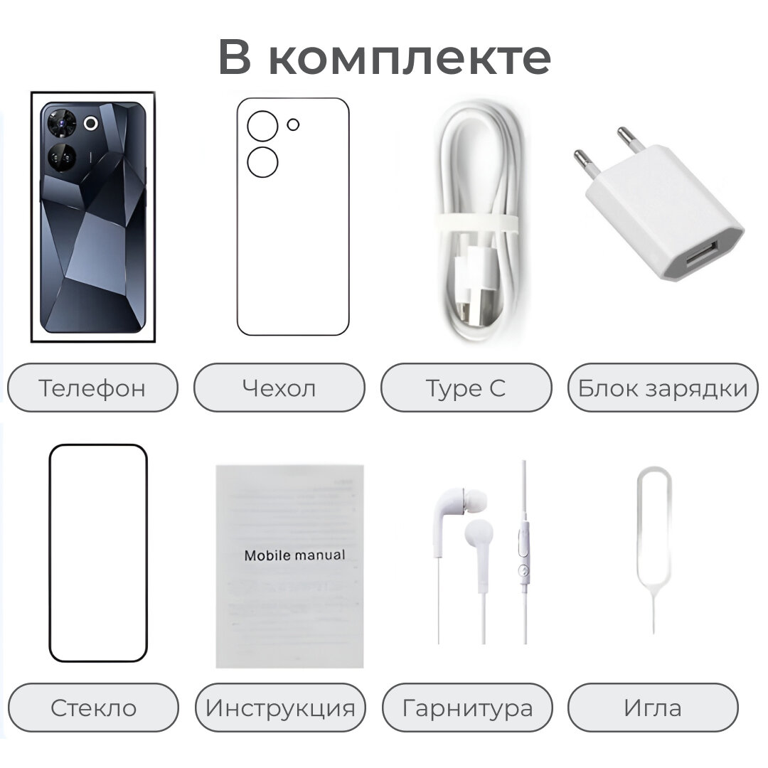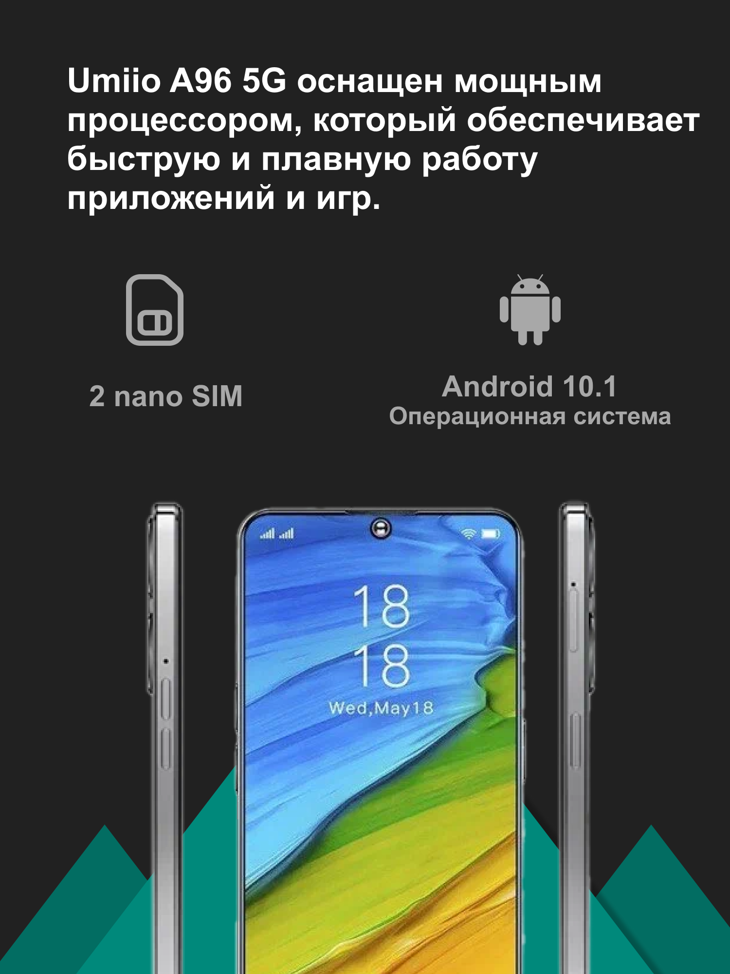 телефон Umiio A96, зарядный кабель с блоком, прозрачный силиконовый чехол, проводные наушники, защитное стекло, эджектор для лотка сим-карты и инструкция