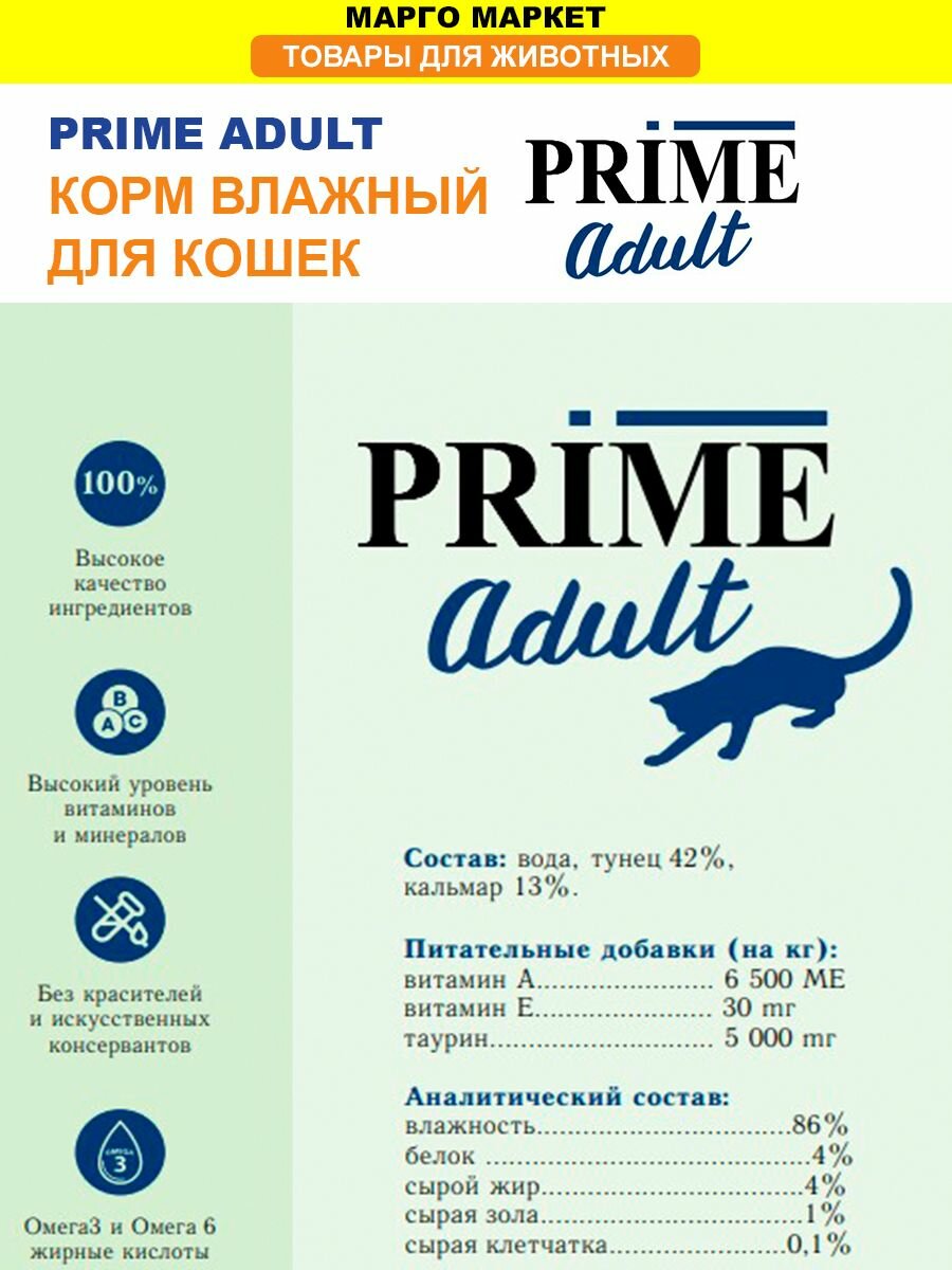 Купить PRIME MEAT ADULT CAT для взрослых кошек с тунцом и кальмаром в собственном соку (70 гр х 24 шт)