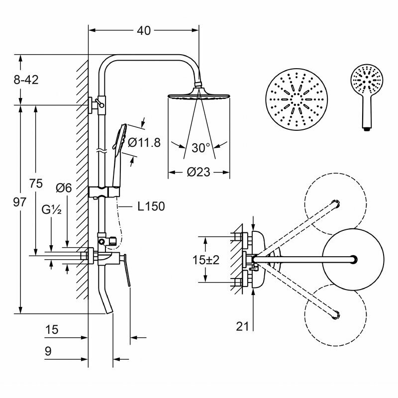 | Дополнительная информация | размер верхнего душа 23 см; размер лейки 11,8 см; вылет верхнего душа 40 см; количество режимов струи 1 |