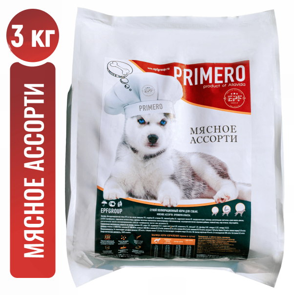 Купить Сухой корм для собак. Мясное ассорти. Премиум Плюс класса Primero. Полнорационный сухой корм для всех пород 3 кг.