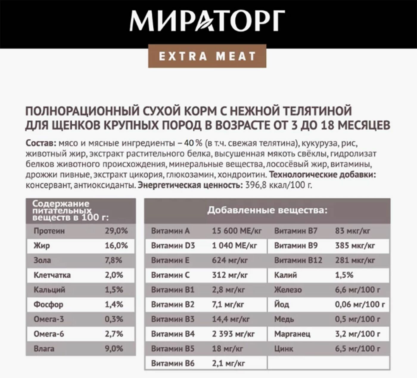 СохранитьПолнорационный сухой корм мираторг EXTRA MEAT c нежной телятиной для щенков крупных пород в возрасте от 3 до 18 месяцев 10 кг интересное: