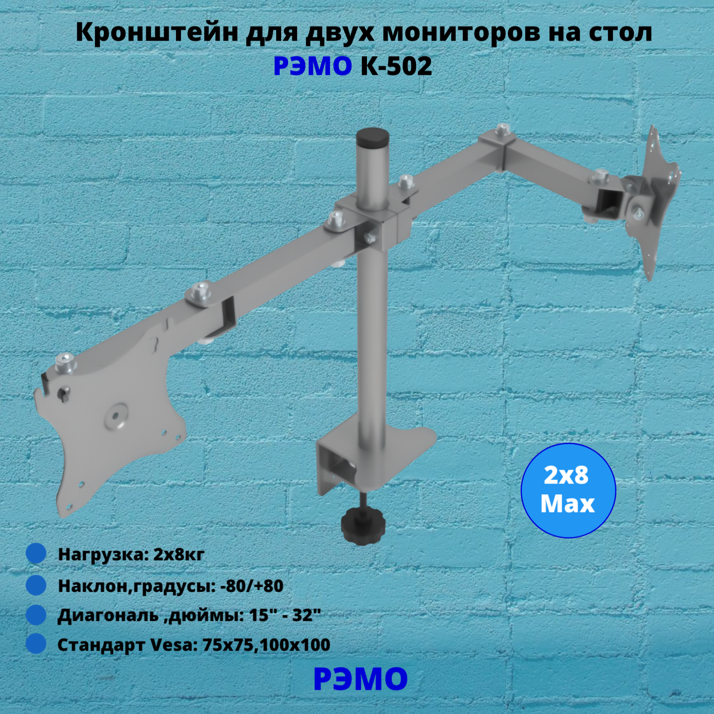 Кронштейн для двух мониторов на стол наклонно-поворотный с диагональю 15"-32" Рэмо К-502,металлик интересное: