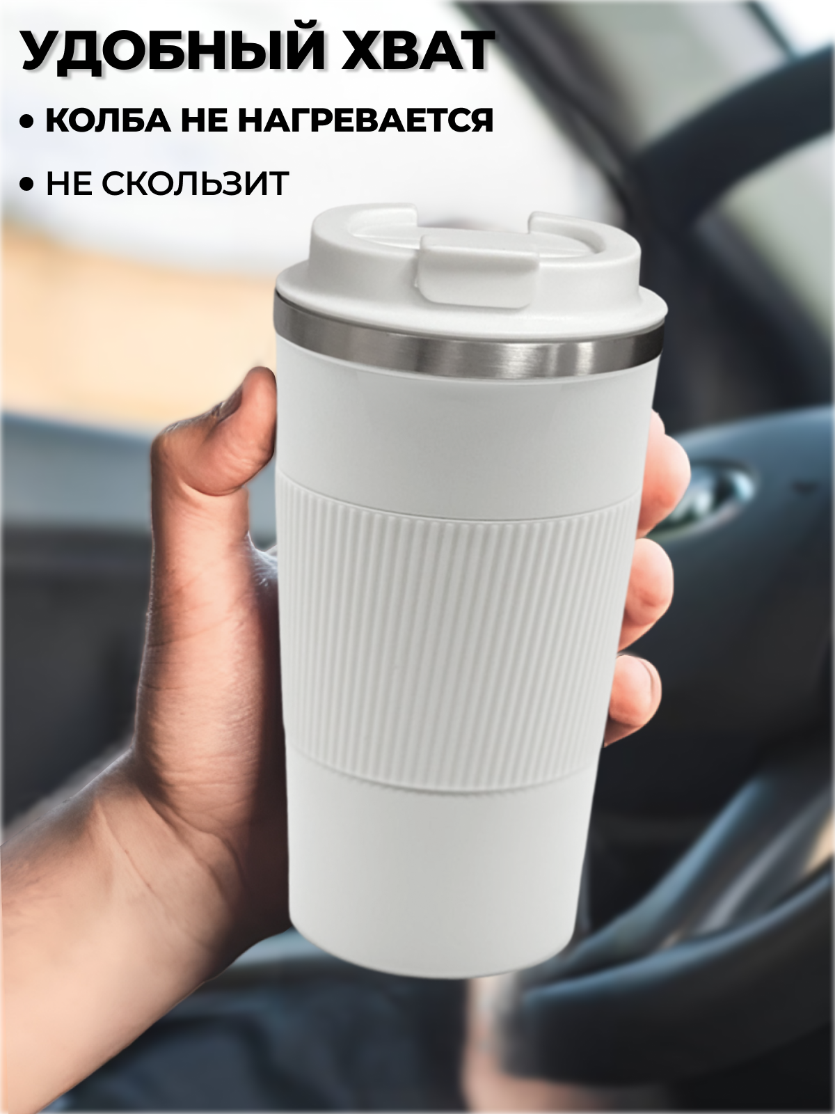 в руке хорошо сидит,не скользит.очень понравилось,что дно прорезиненное.крышка плотно закрывается.тепло держит долго.очень довольна