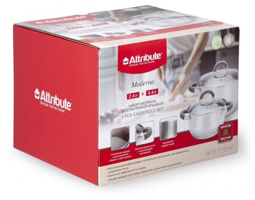 Набор кастрюль ATTRIBUTE из нержавеющей стали для индукционных плит / кастрюля с крышкой 3.4 л + ковш с крышкой 1.7 л