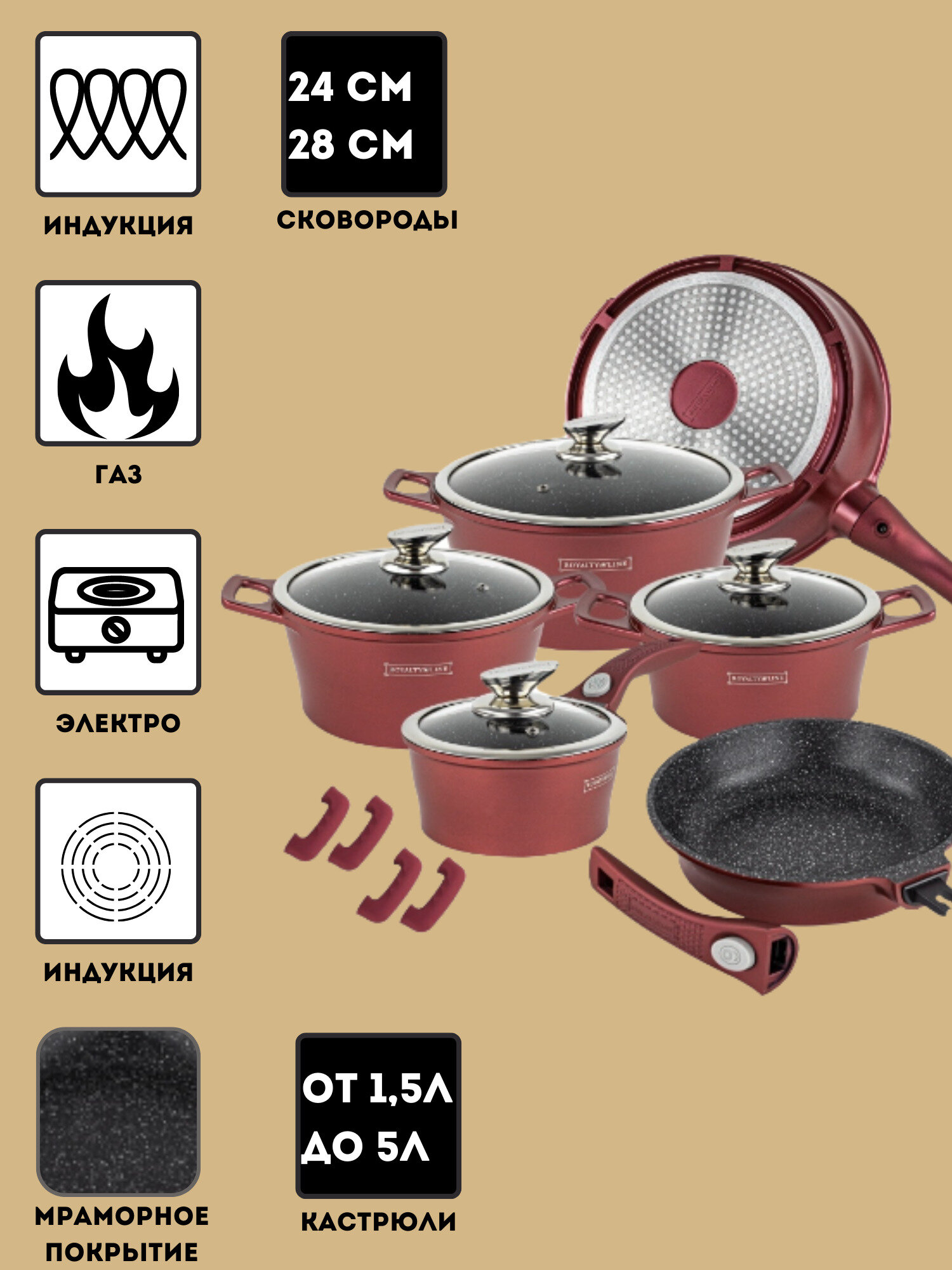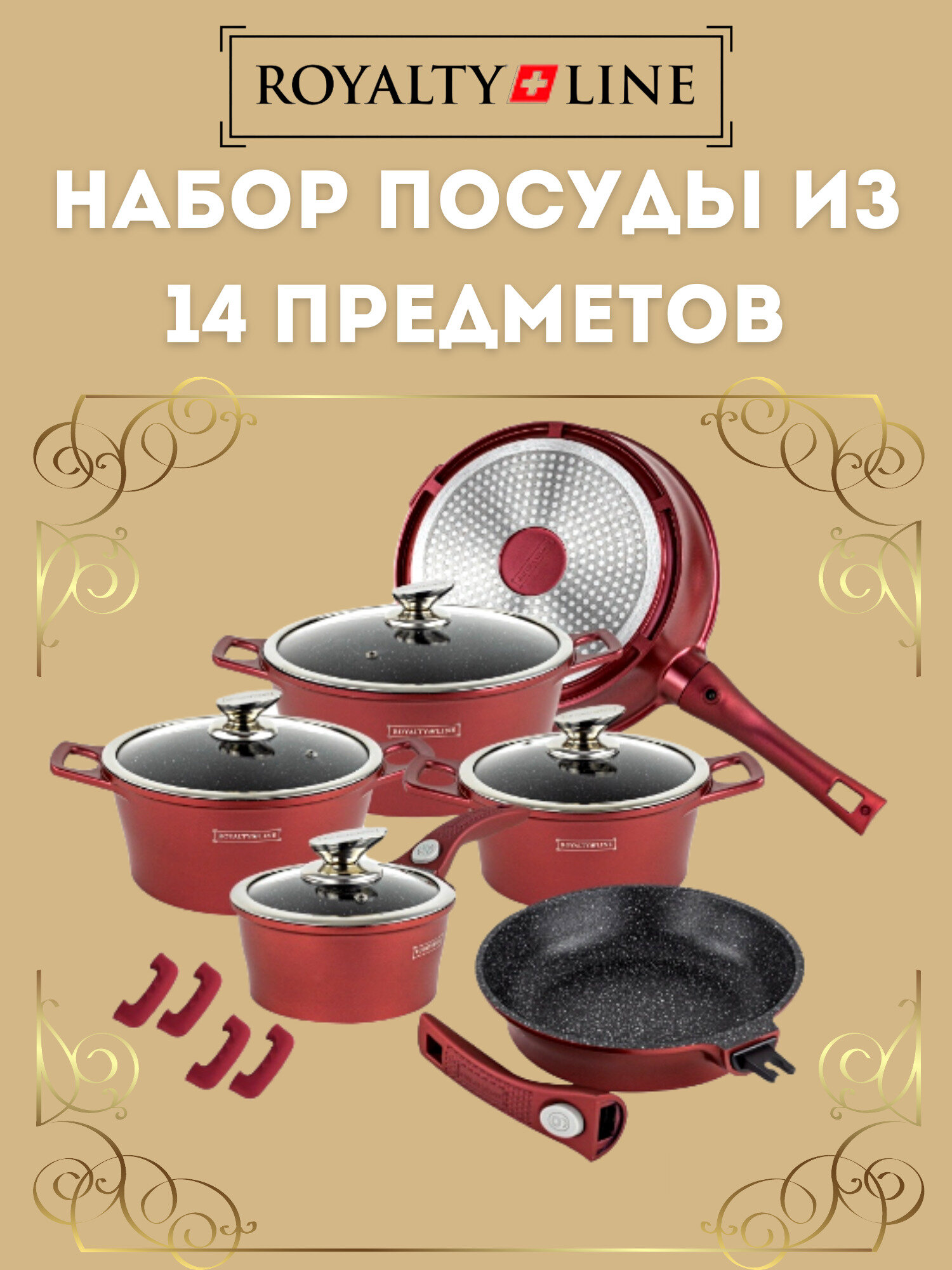 Набор посуды для приготовления Royalty Line. 14 предметов: набор кастрюль, универсальная сковорода, сковорода гриль. Мраморное антиприграное покрытие. интересное: