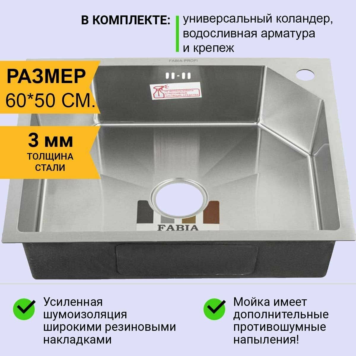 Мойка нержавеющая врезная 60х50 сатин FABIA Profi (3.0х200) выпуск 3 1/2 с сифоном, с коландером