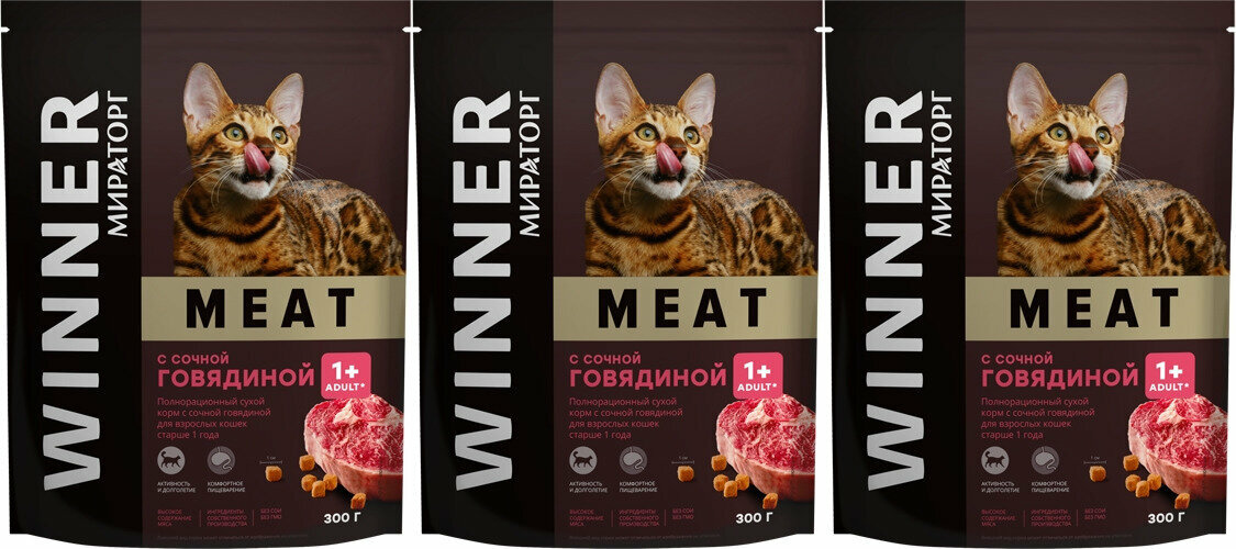 Купить Сухой полнорационный корм Мираторг WINNER MEAT 3х300гр для взрослых кошек старше 1 года всех пород с сочной говядиной
