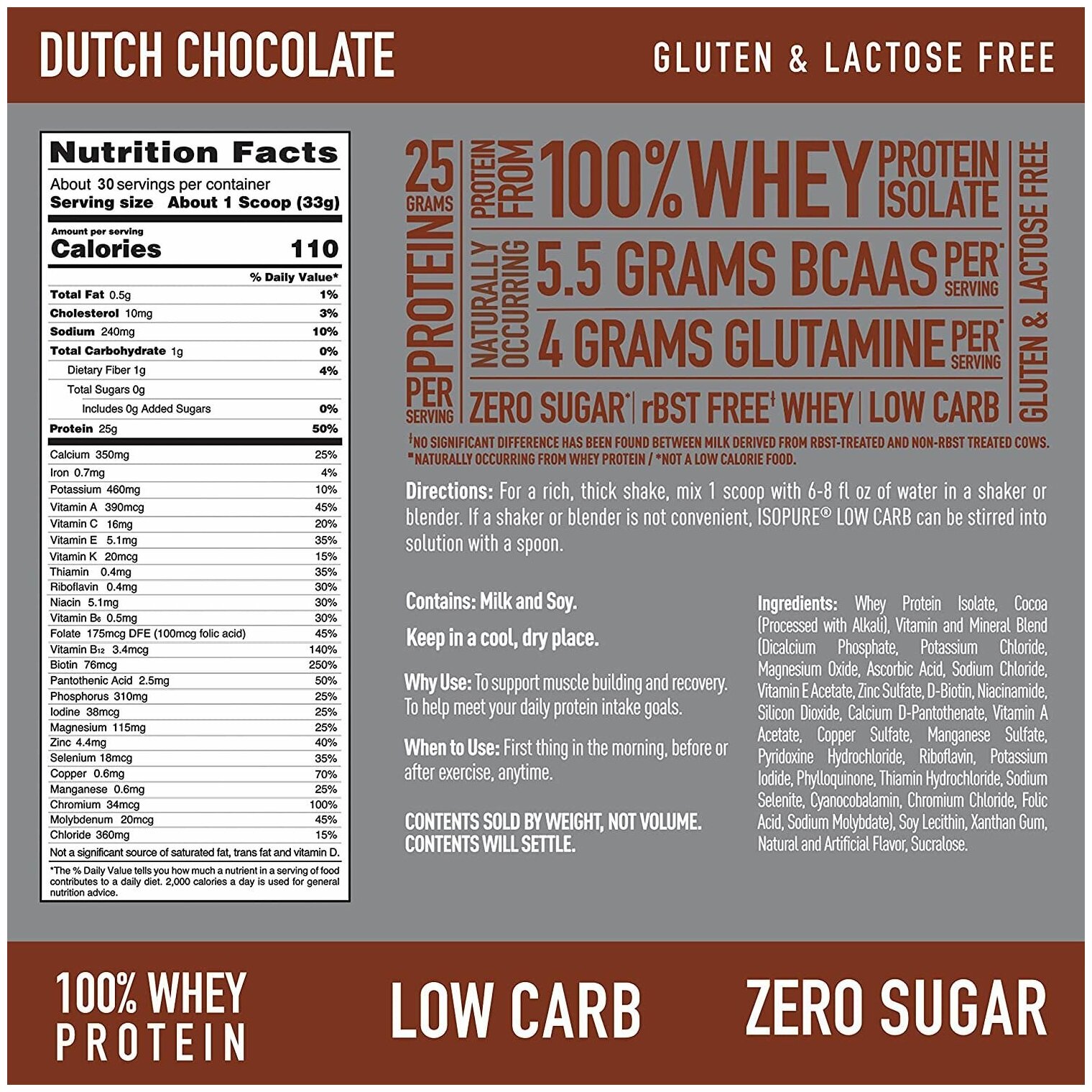 | Дополнительная информация | размер порции в г(мл): 33; состав: Изолят сывороточного протеина, какао (обработанное щелочью), смесь витаминов и минералов (дикальцийфосфат, хлорид калия, оксид магния, аскорбиновая кислота, хлорид натрия, сульфат цинка, D-альфа-токоферилацетат, ниацинамид, D-пантотенат кальция, сульфат меди, Сульфат марганца, гидрохлорид пиридоксина, рибофлавин, гидрохлорид тиамина, ацетат витамина А, хлорид хрома, фолиевая кислота, D-биотин, йодид калия, молибдат натрия, селенит натрия, фитонадион, цианокобаламин), соевый лецитин, L-глютамин, ксантановая камедь, натуральный и искусственный ароматизатор, сукралоза. |