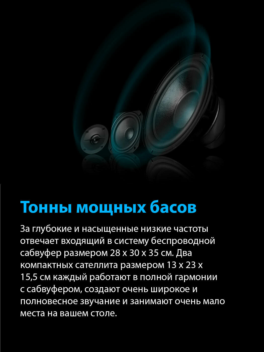 | Минусы: | Их просто нет. Смотрите габариты колонок и саба. |