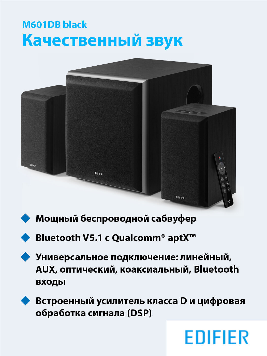 Купить Колонки с сабвуфером Edifier M601DB акустическая стерео система 2.1 - 110 Вт, Bluetooth 5.1, пульт ДУ, чёрная