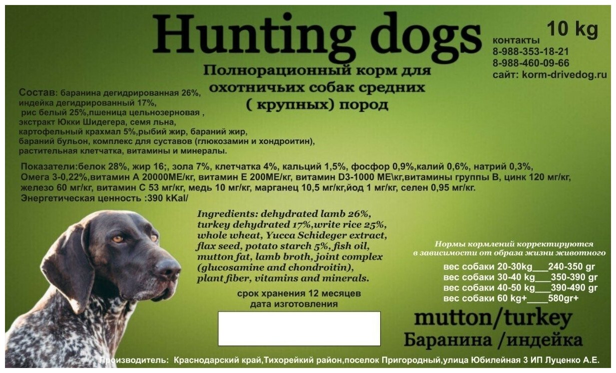DRIVE DOG Hunting dogs полнорационный корм для охотничьих собак средних и крупных пород баранина с индейкой (15 кг)