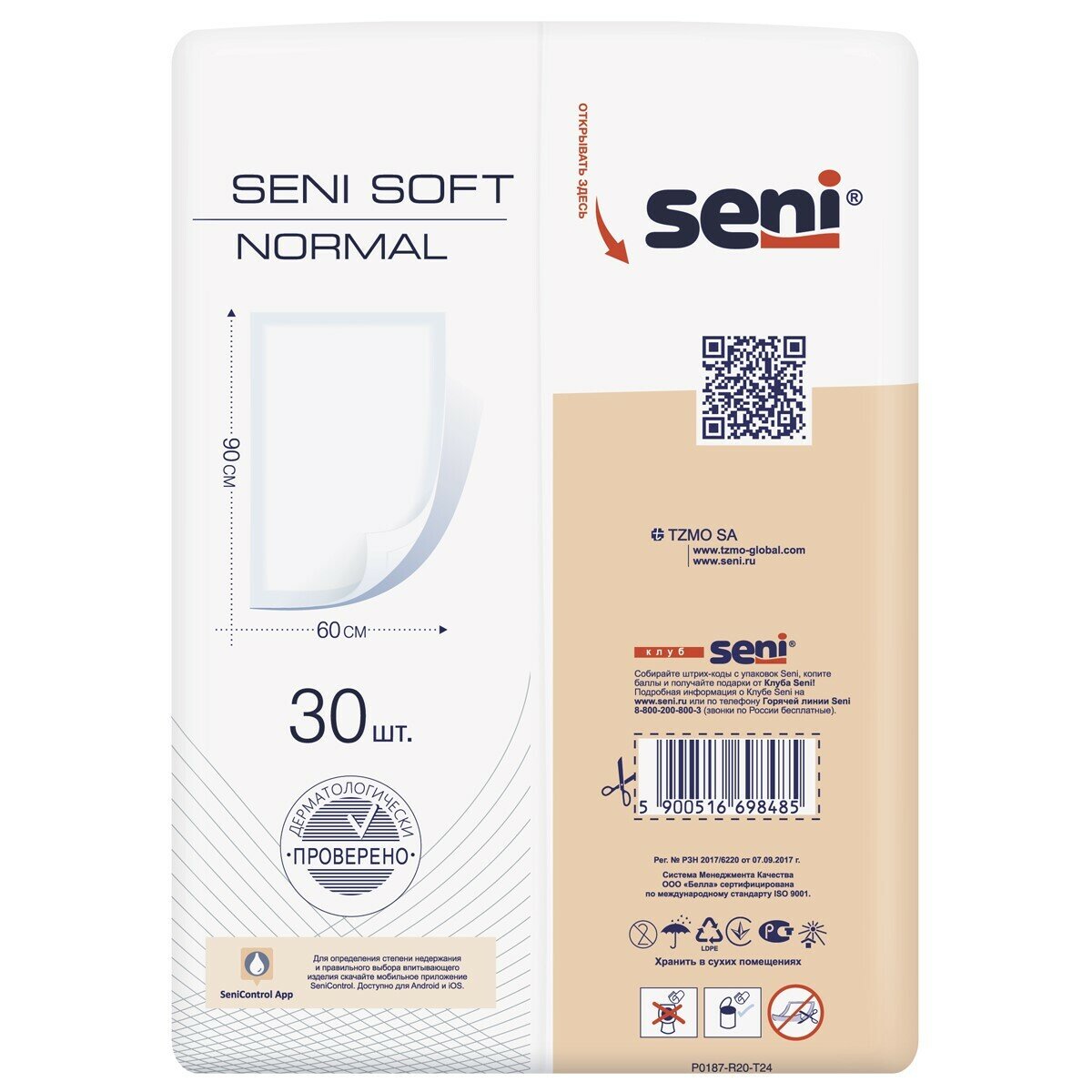 Пеленки 60х90 см, SENI SOFT NORMAL, комплект 30 шт., впитывающие, одноразовые, ш/к 98485