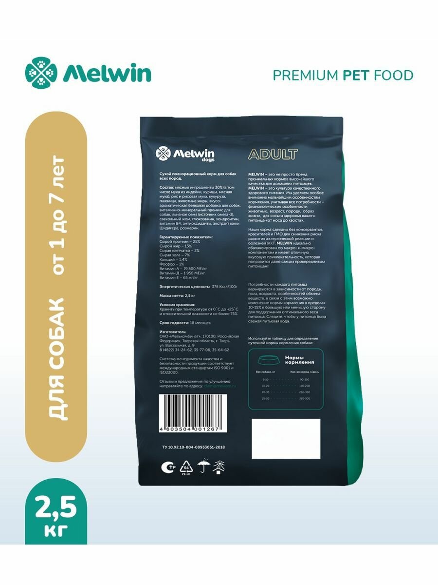 Купить Melwin сухой корм для собак от 1 до 7 лет с индейкой и рисом, 2,5 кг