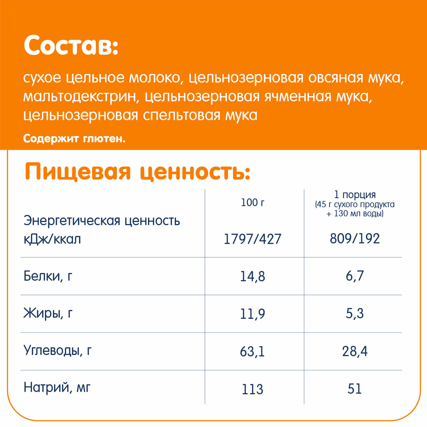 | Состав | сухое цельное молоко*, цельнозерновая овсяная мука*, мальтодекстрин*, цельнозерновая ячменная мука*, цельнозерновая спельтовая мука* *органическое сельское хозяйство соответствует законодательству ЕС (Регламенты ЕС №834/2007, №889/2008) |