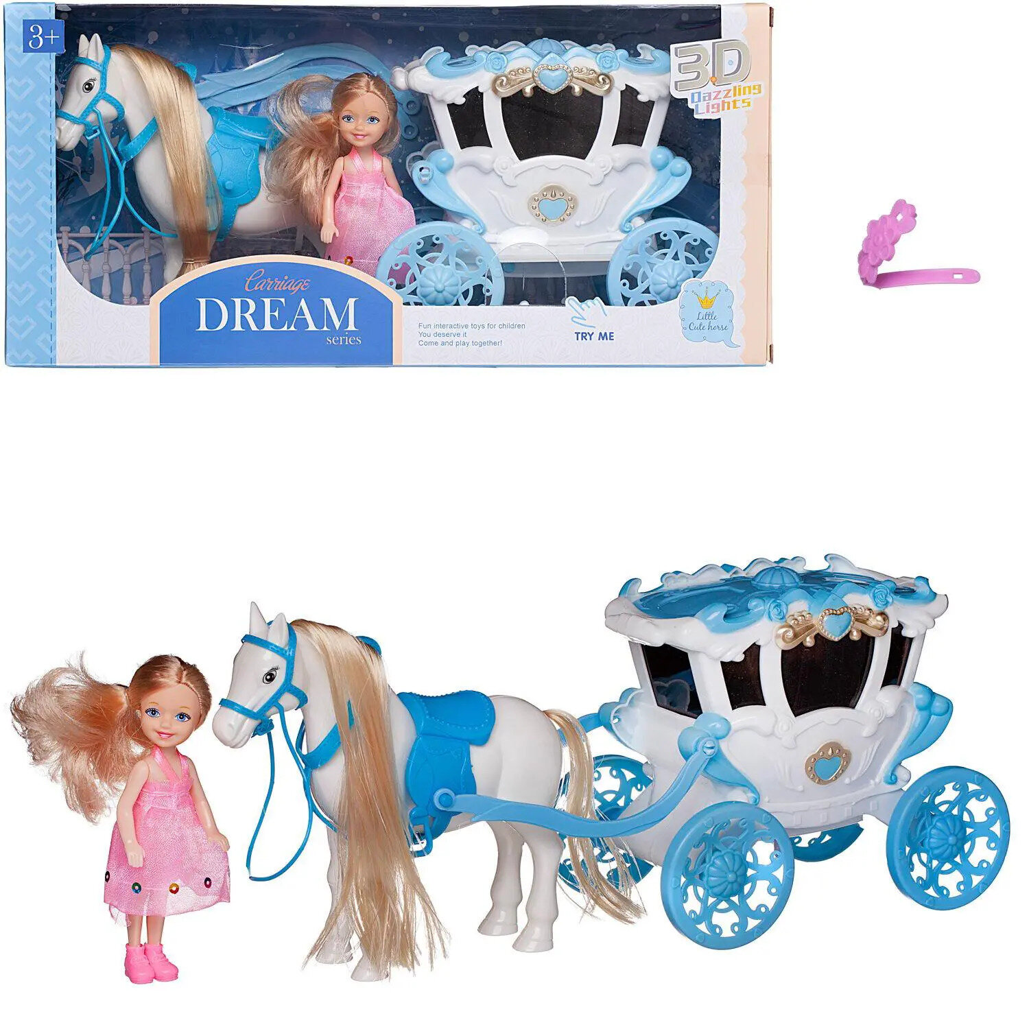 Лошадка в наборе с бело-розовой каретой и куколкой, со световыми и звуковыми эффектами, в коробке 38х12,5х19см