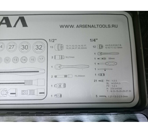 | Головки торцевые подробно | 1/4": 4, 4.5, 5, 5.5, 6, 7, 8, 9, 10, 11, 12, 13 мм; 1/2": 10, 11, 12, 13, 14, 15, 17, 19, 22, 24, 27, 30, 32 мм; свечные магнитные: 16, 21 мм; трещотки: 1/2", 1/4"; со вставками: SL4, SL5.5, SL6.5, PH1, PH2, PH3, PZ1, PZ2, PZ3, H2.5, H3, H4, H5, H6, TR8, TR10, TR15, TR20, TR25, TR27, TR30; вороток Т-образный 115 мм; удлинитель 1/4": 55 мм; шарнир карданный: 1/4", 1/2"; переходник 1/2"Х3/8"; удлинители 1/2": 75, 250 мм |