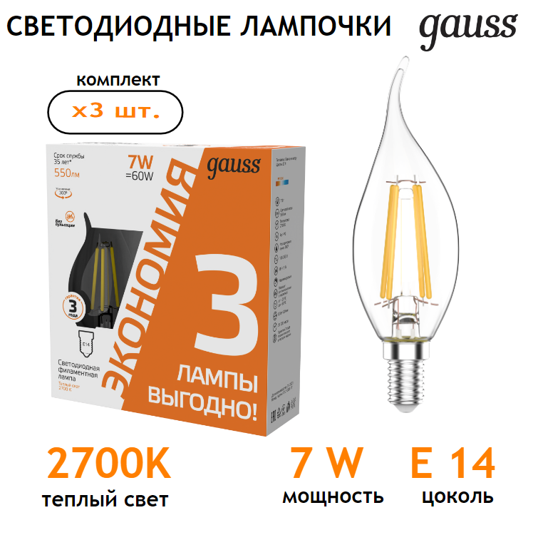 Лампочка светодиодная Е14 Свеча на ветру 7W Комплект 3 шт. теплый свет 2700К Gauss Basic Filament