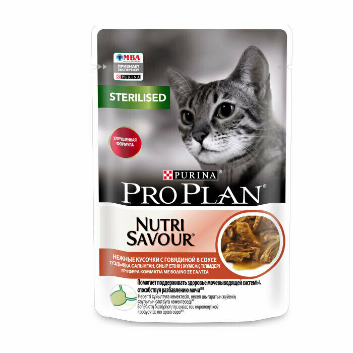 Влажный корм PRO PLAN® паучи для взрослых стерилизованных кошек, с говядиной в соусе, Sterilised MAINTENANCE, 26 шт