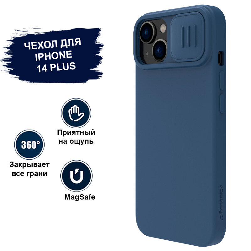 Чехол для iPhone 14 Plus Nillkin MagSafe синий, силиконовый, противоударный с усиленными углами и защитой камеры интересное: