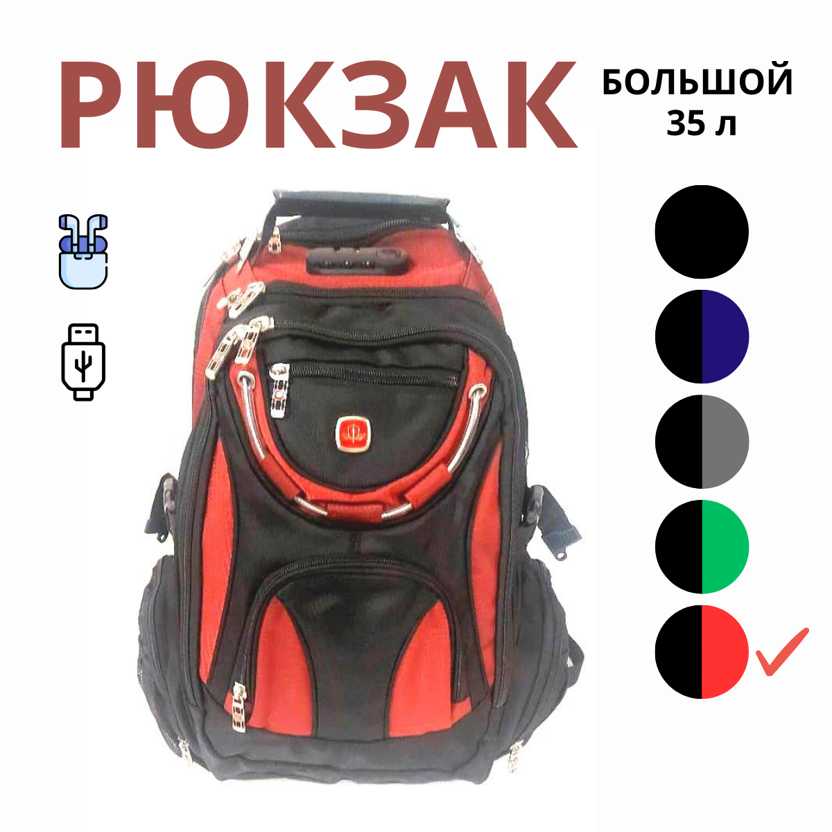 Рюкзак мужской городской спортивный 35л, USB, черный/красный интересное: