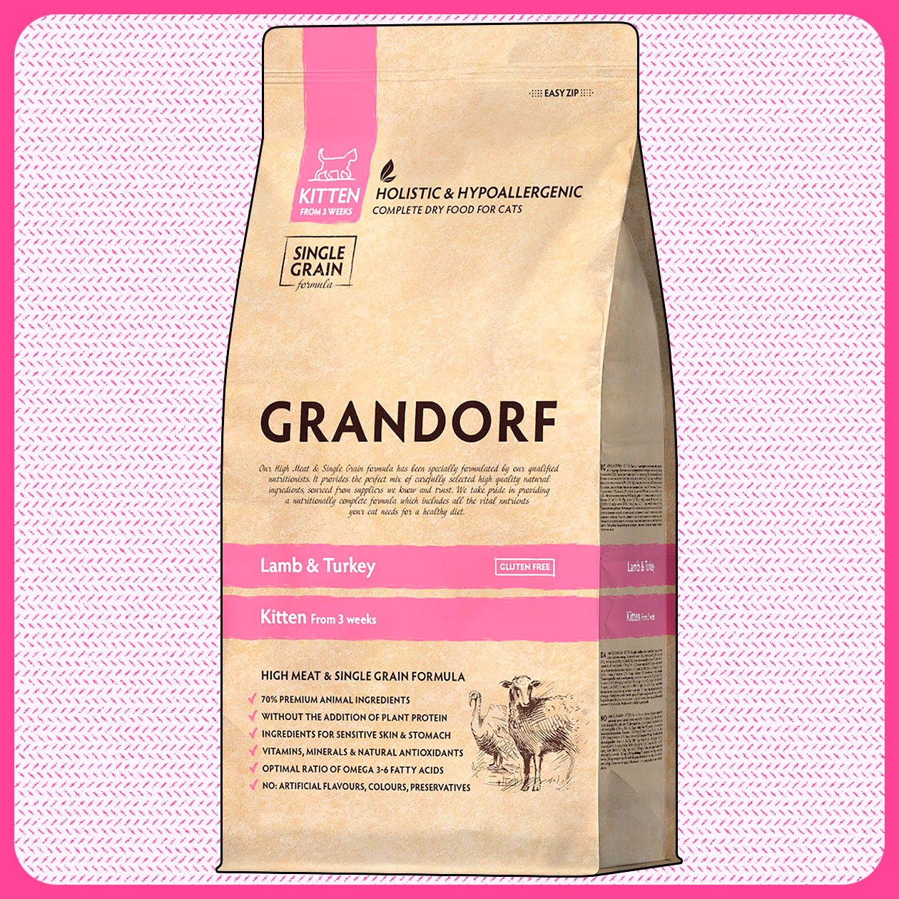 Корм сухой для кошек GRANDORF Ягнёнок с индейкой (рис) Kitten 2кг. Для котят в возрасте от 3 недель, беременных и кормящих кошек. С пробиотиками, низкозерновой.