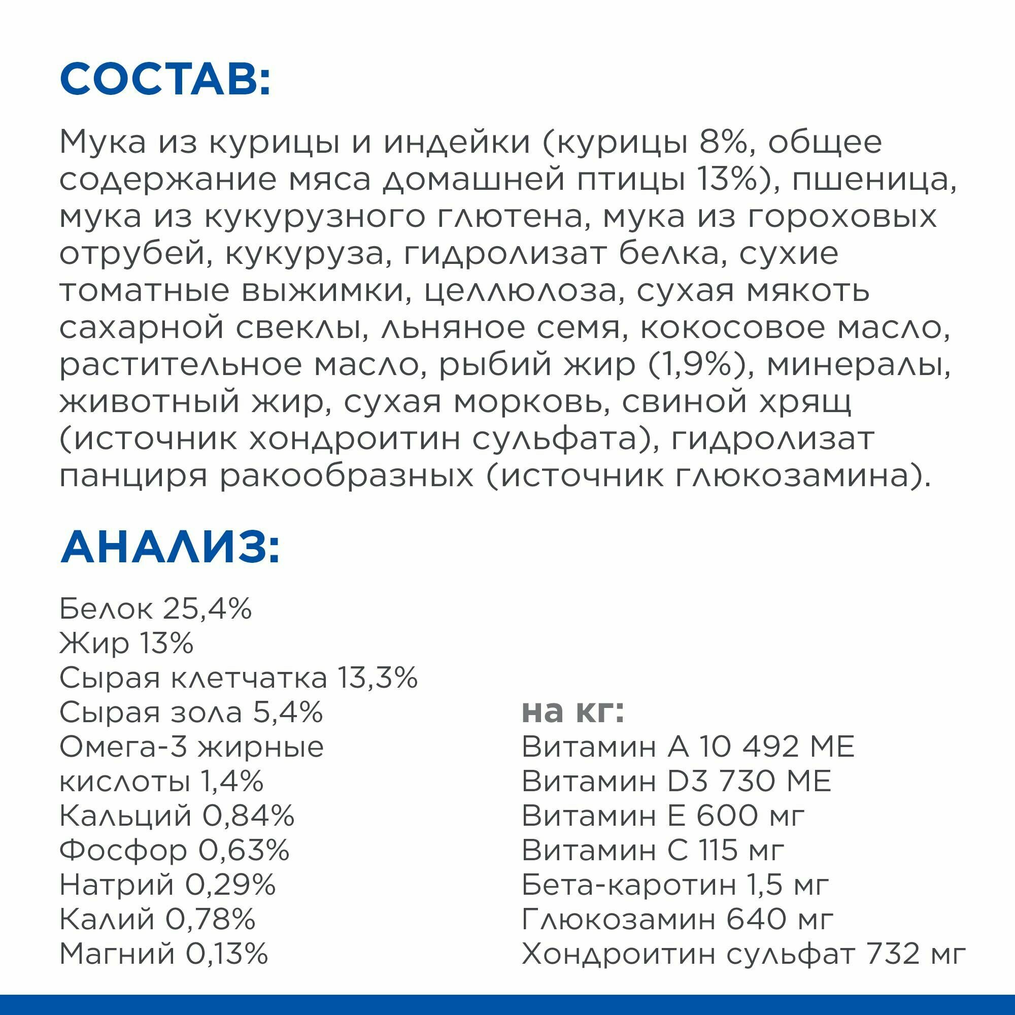 | Пищевая ценность | Белок 25,4%, Жир 13,0%, Сырая клетчатка 13,3%, Сырая зола 5,5%, Омега-3 жирные кислоты 1,4%, Кальций 0,84%, Фосфор 0,63%, Натрий 0,29%, Калий 0,78%, Магний 0,13%; на кг: Витамин А 10 492МЕ, Витамин D3 730МЕ, Витамин E 600мг, Витамин С 115мг, Бета-каротин 1,5мг, Глюкозамин 640мг, Хондроитина сульфат 732мг. |