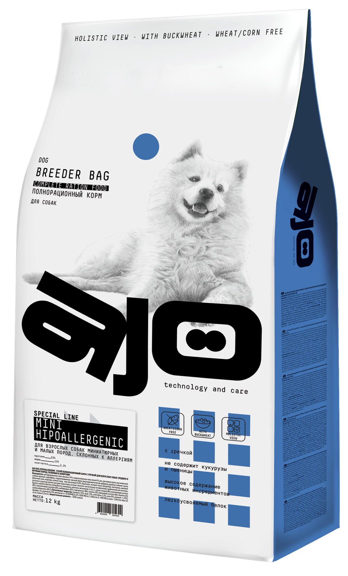 AJO Mini Hypoallergenic сухой для собак миниатюрных и малых пород, склонных к аллергиям с гречкой 12кг