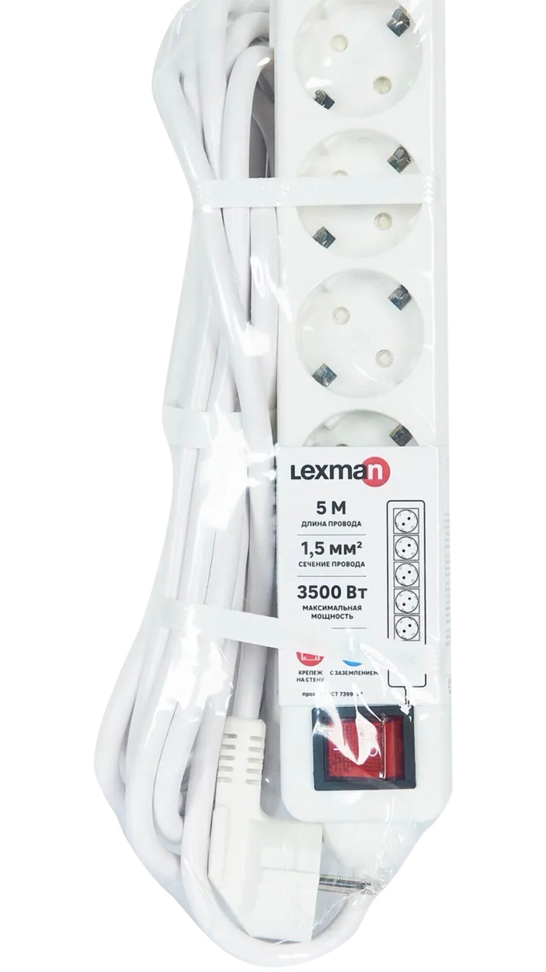 Купить Сетевой фильтр Lexman 5 розеток с заземлением 3х1.5 мм 5 м 3500 Вт цвет белый / Удлинитель