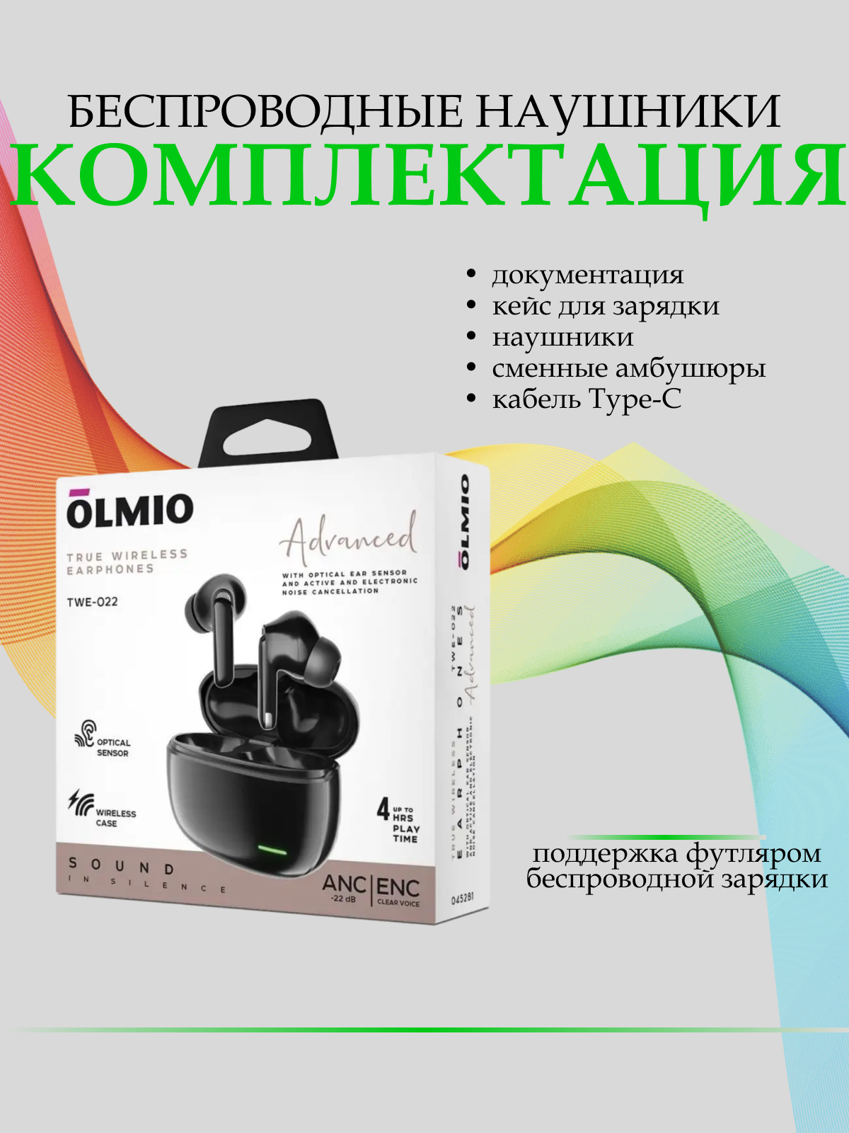 Беспроводные наушники OLMIO TWE-022, шумоподавление, черные