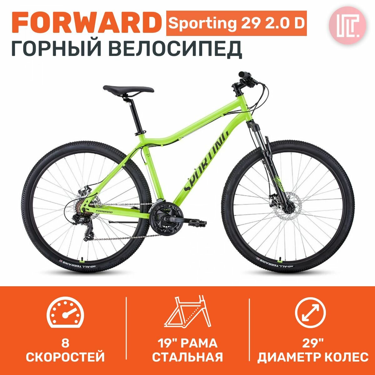 Купить Велосипед Forward Sporting 29 2.0 D (29' 8 ск. рост. 19') 2023, ярко-зеленый/черный, Rb3r98140bgnxbk