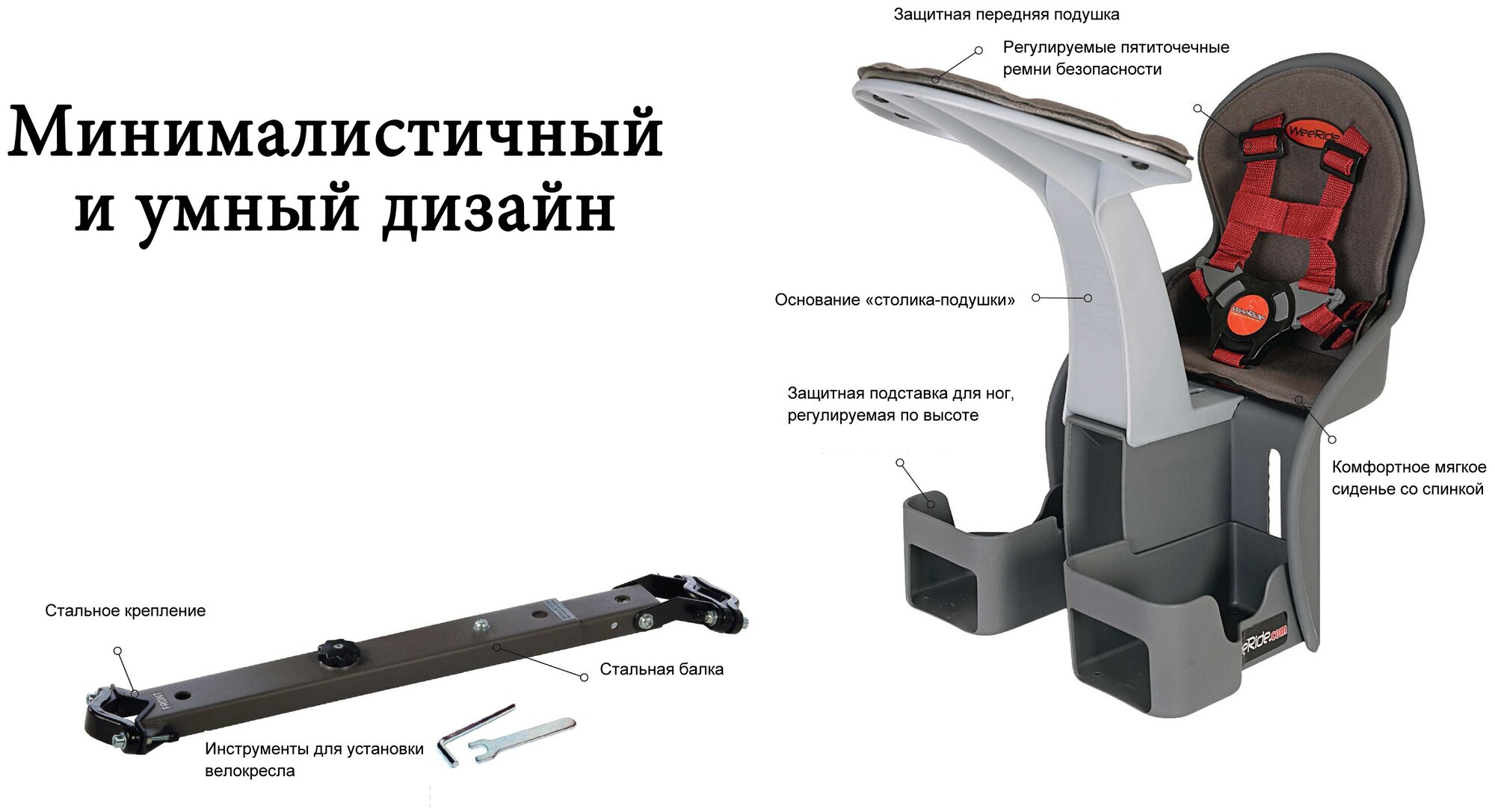 | Особенности | быстросъемное крепление / мягкая накладка на сиденье / регулировка подножки |