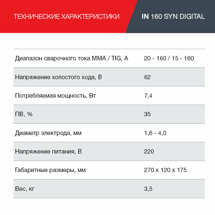| Сварочный ток (MMA), max | 160 А |
