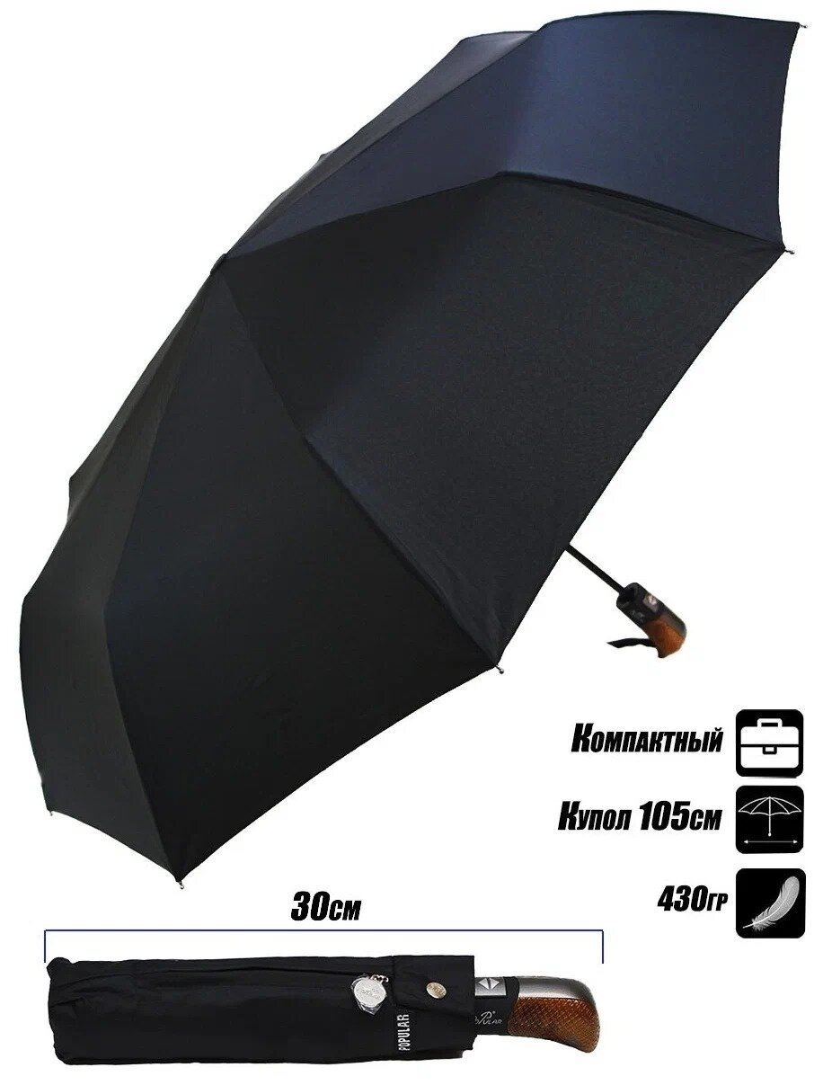 Зонт Popular, автомат, 3 сложения, купол 105 см., 9 спиц, система «антиветер», чехол в комплекте, для мужчин, коричневый, черный интересное: