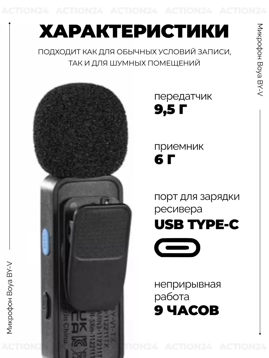 | Подробная комплектация | Передатчик BY-V2-TX ×2, Приемник BY-V20-RX ×1, Кабель для зарядки USB-C × 2, Поролоновая ветрозащита ×2 |